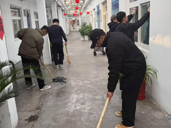 清晨,志愿者们早早来到老年公寓,带着清洁工具开始了一天的劳动。几名身着黑色羽绒服的年轻人分工合作,有的拿起拖把清扫走廊,有的用抹布擦拭窗户玻璃。阳光透过玻璃窗洒在地面,映照出他们忙碌的身影。走廊两侧的红灯笼增添了几分节日气氛,而志愿者们专注的表情让整个场景充满生机。一位年近六旬的老人路过,驻足观看,不时点头称赞他们的努力。