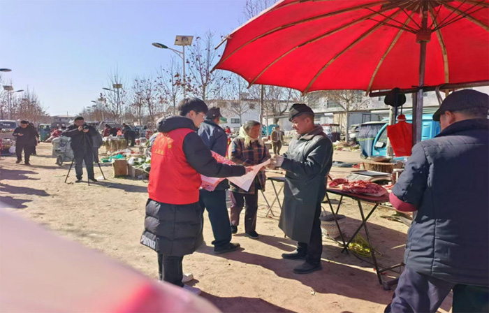 图为实践团成员付丙添给大集上的顾客发放新年挂历