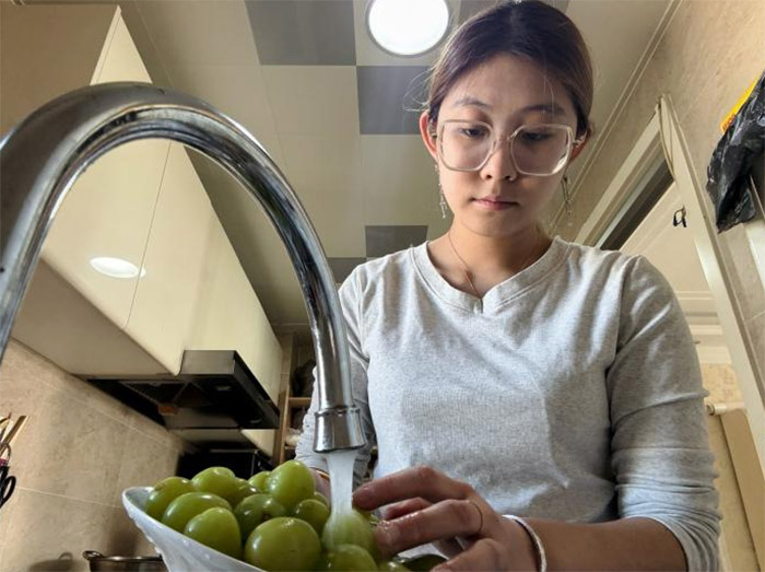 图为“暖阳相伴”实践团成员卢湘宇在为老人清洗水果