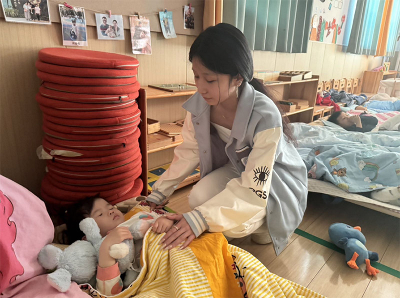图为实践团成员闫若曦哄幼儿睡觉,整理被褥