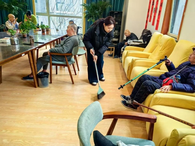 王淑慧则承担起清洁工作,她认真打扫公寓的每一个角落,擦拭桌椅、清扫地面,不放过任何一处灰尘,让公寓环境干净整洁。