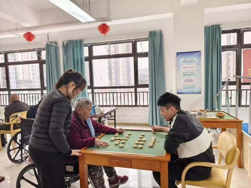 实践团成员董传硕组织起了象棋娱乐活动,他耐心地教老人们下象棋,讲解规则,在棋局中还巧妙地制造轻松氛围,让老人们在娱乐中收获快乐,公寓里不时传来阵阵欢声笑语。尹佳瑞细心地为老人们整理床铺,她把床单铺得平平整整,被子叠得方方正正,还贴心地调整了枕头的位置,让老人们能舒适地休息。