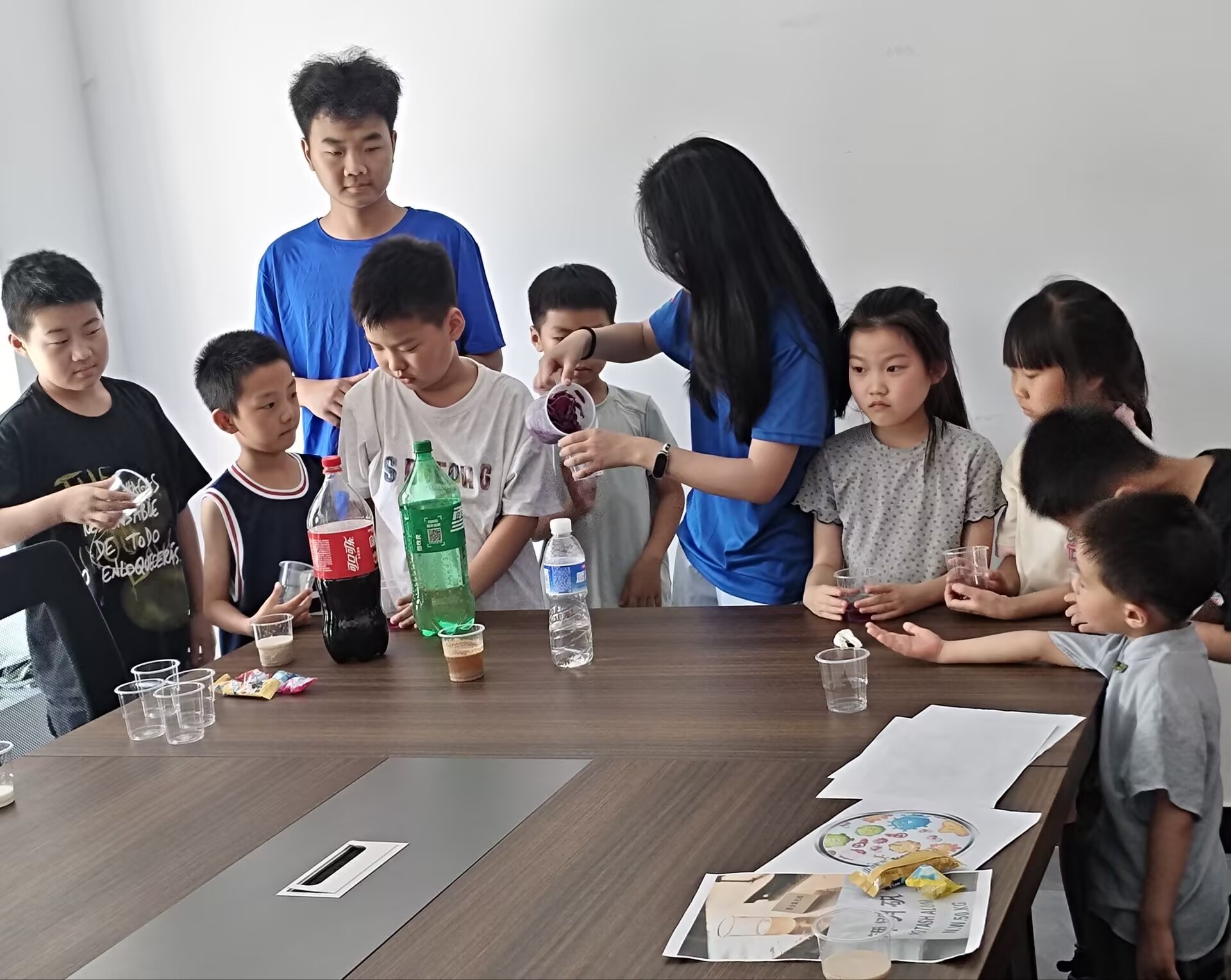 活动在孩子们的期待中展开。实践团成员首先通过精心准备的PPT,以生动有趣的方式向孩子们传授食品安全知识,详细讲解如何辨别问题食品。随后,团队成员化身"科学魔法师",通过"紫甘蓝变色魔法""可乐与牛奶的秘密"等趣味实验,带领孩子们开启了一场奇妙的科学探索之旅。这些实验不仅让孩子们感受到化学的魅力,更帮助他们理解化学知识在食品安全中的实际应用。活动尾声,实践团播放了精心挑选的食品安全科普动画,通过生动形象的画面进一步强化了孩子们的食品安全意识。