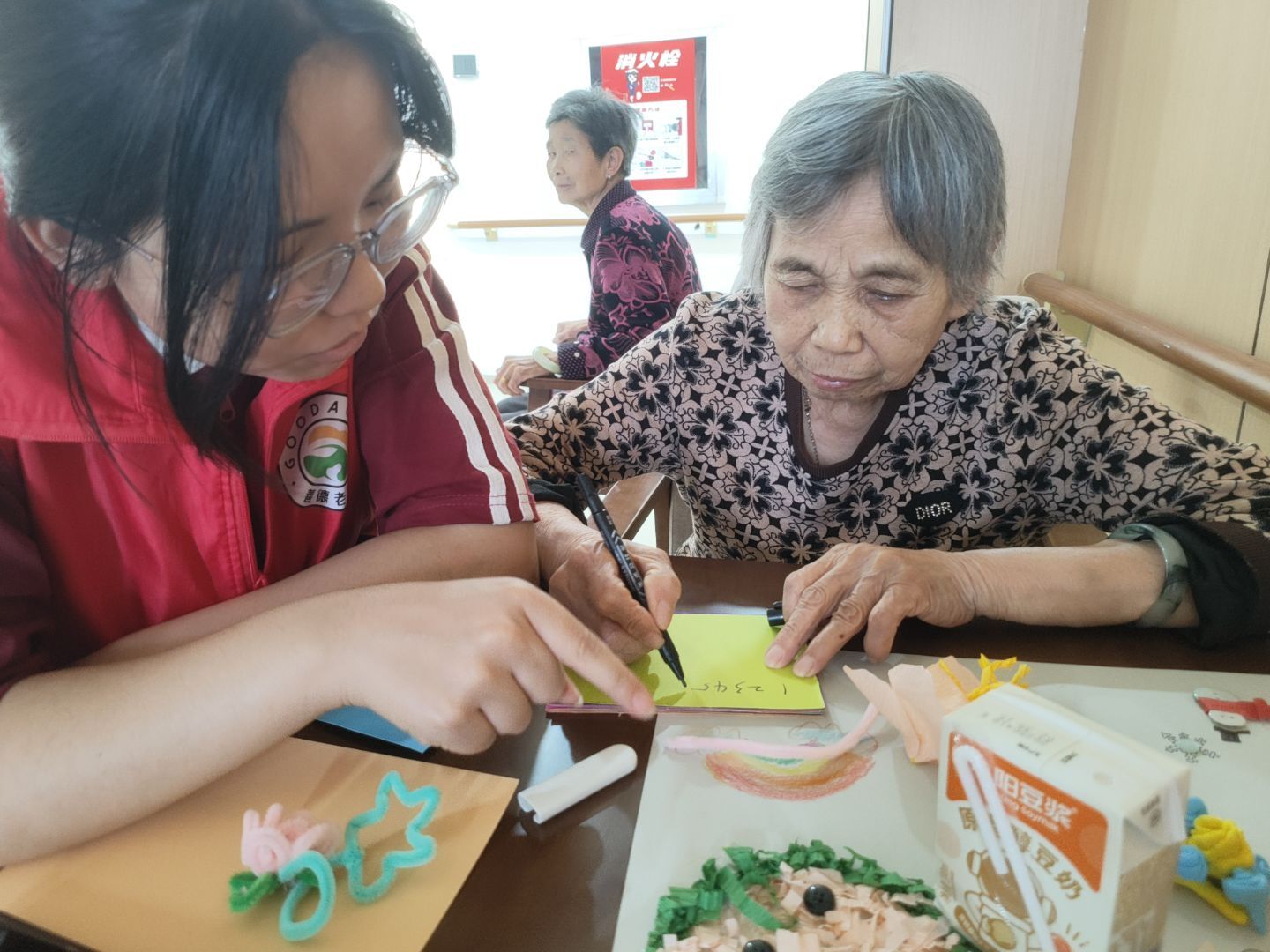上午10点,养老院组织开展陶艺活动,志愿者们一对一协助老人一同完成陶艺活动,现场欢声笑语,妙趣横生。下午1点,志愿者们前往公寓5楼,主动帮助公寓负责人粘贴画框。过程中大家相互帮助,积极配合,高效的完成了工作,帮助养老院减轻了一定的人员压力。志愿者们也在活动中认识到志愿服务大众带来的快乐。