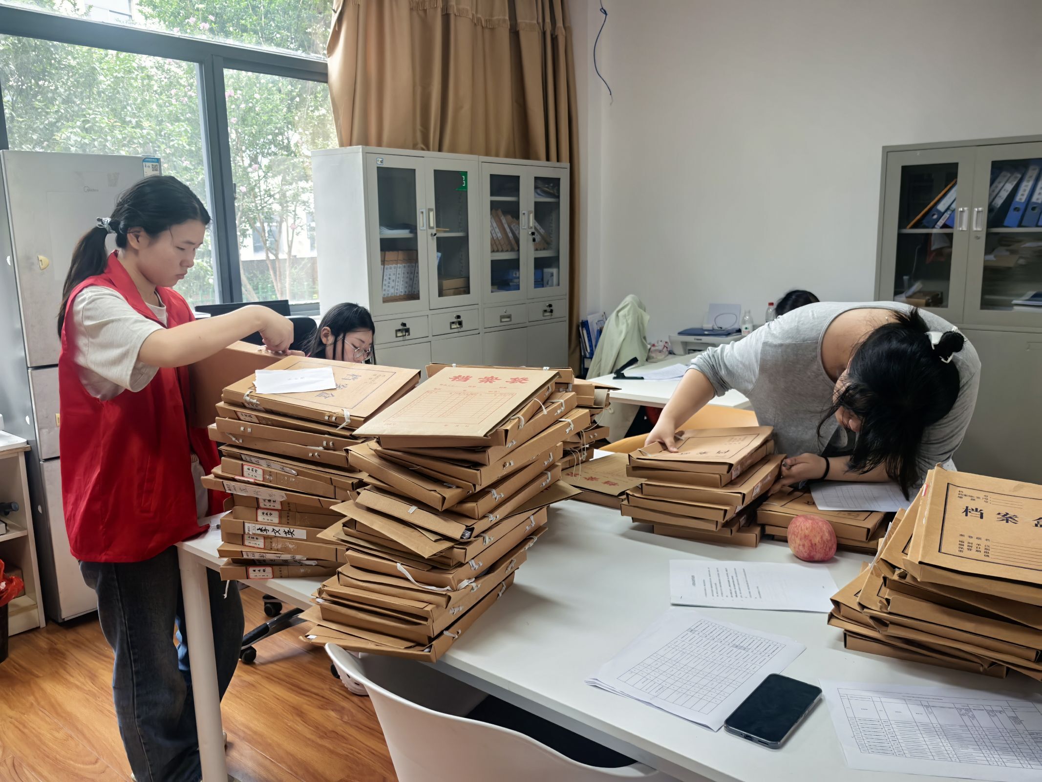 图为志愿者们正在办公室整理档案文件。 叶欣雨 供图