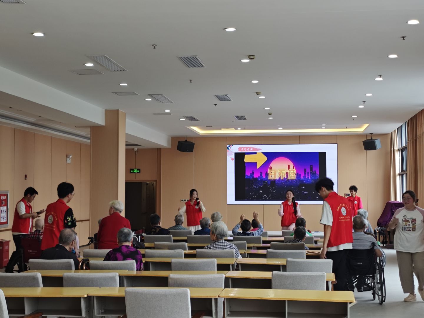 下午2点半到3点半,公寓一楼活动区开展大学生汇演活动。志愿者们在积极参与筹备活动的同时,社工部的志愿者们策划后期活动与打印文件资料;办公室的志愿者们整理相关资料,排查养老院档案文档;失智专区的志愿者制作了彩纸小卡,用通俗易懂的方式传播着专业知识,让老人简单了解英语的魅力。这些准备使得下午的活动开展的井然有序,养老院的老人对活动也给予了高度的评价,活动现场妙趣横生。