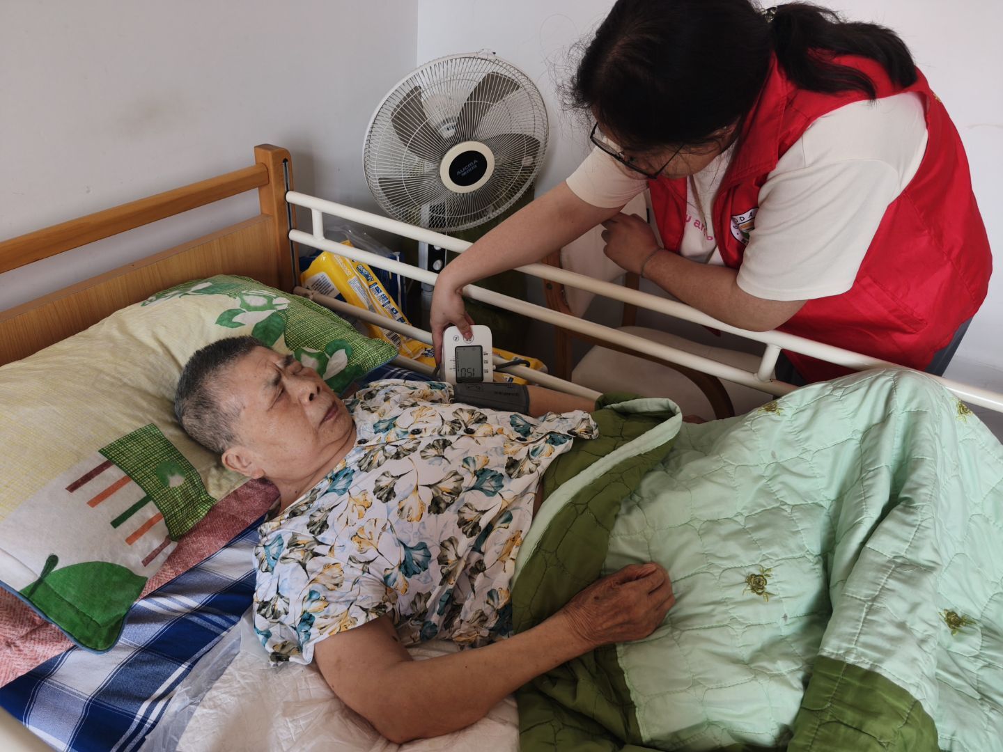图为志愿者正在帮行动不便的老人测量血压。阿诗怡 供图