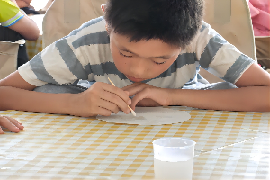 密信制作兴趣课在碘钟实验后展开。队员们提前准备四种制作方法,组织孩子们分组尝试。其中一种方法中,孩子们用棉棒蘸取淀粉溶液在纸上书写,待纸张干透后字迹消失,喷上碘液便能重新显色。队员们在各组间巡回指导,引导孩子们观察不同方法中的颜色变化,寻找其中的共性规律。孩子们低头认真书写,有的写下秘密,有的描绘梦想,在化学变化的奇妙中,为他们的秘密与梦想找到了独特的隐藏与呈现方式。