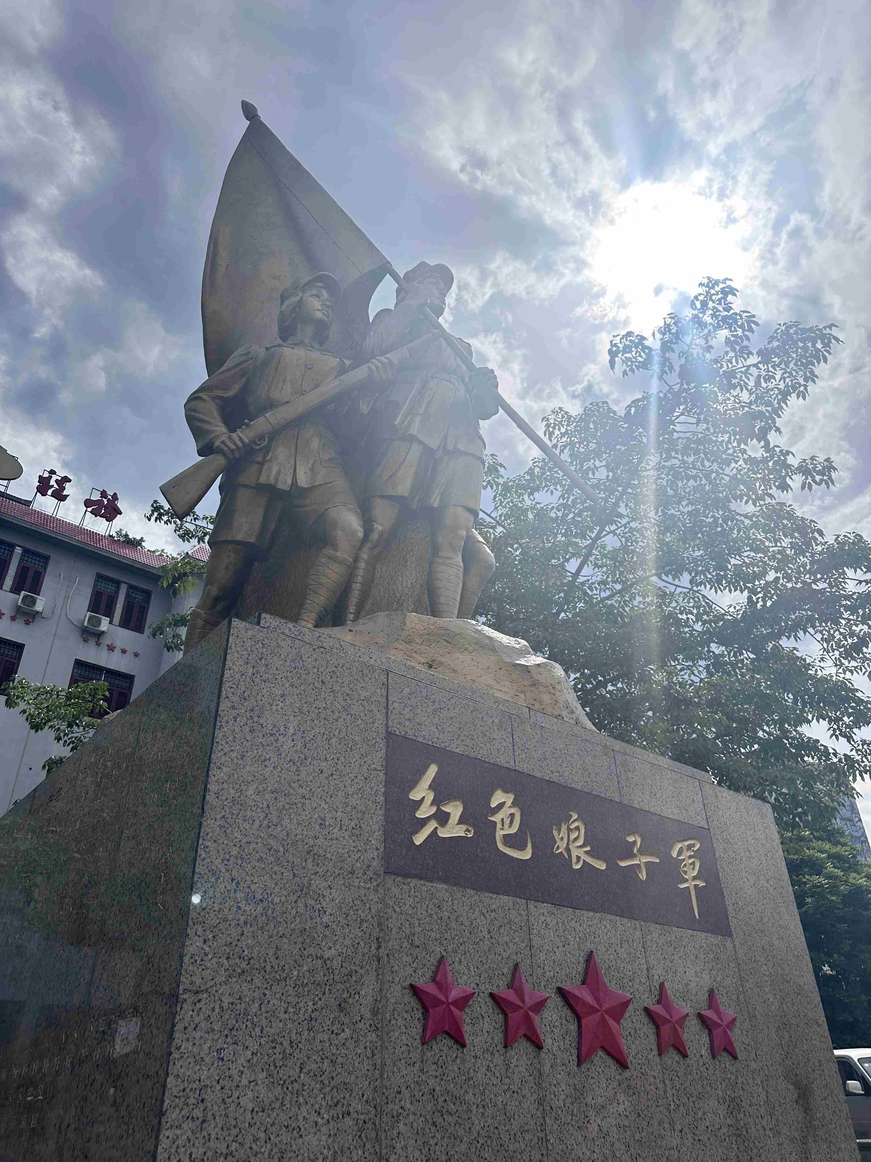 红妆铁骨,琼崖星火 午后的阳光洒满大地,空气中弥漫着庄重肃穆的气息。队员们首先来到了不远处的阳江镇红色娘子军群像设立处。三座红色娘子军战士的群像栩栩如生,她们头戴红五星八角帽,有的手握军旗,有的肩挎长枪、身背斗笠,昂首挺胸,目光坚毅,展现出巾帼英雄的飒爽英姿。队员们通过查阅资料得知:1931年5月1日,中国工农红军第二独立师第三团女子军特务连就在这里成立,这是中国共产党领导下第一支成建制的女子军连队。在那个女性地位低下的年代,这群娘子军战士勇敢地冲破封建束缚,拿起武器,投身革命斗争,参加了50多次大小战斗,在沙帽岭伏击战、文魁岭战斗等战役中屡建奇功,为琼崖革命作出了重要贡献。
