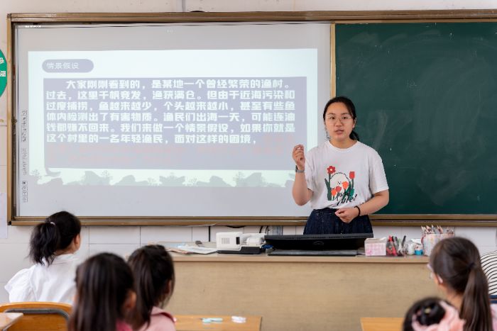 投影仪上流淌出“云儿飘在海空,鱼儿藏在水中”的歌词,首堂“诗中渔影,千年传承”课由此拉开序幕,像一汪清泉漾起层层波光。视频里,渔夫撒网、补船的画面引领同学们闯入渔家的奇妙世界,唤醒了对渔民生活的点滴记忆。