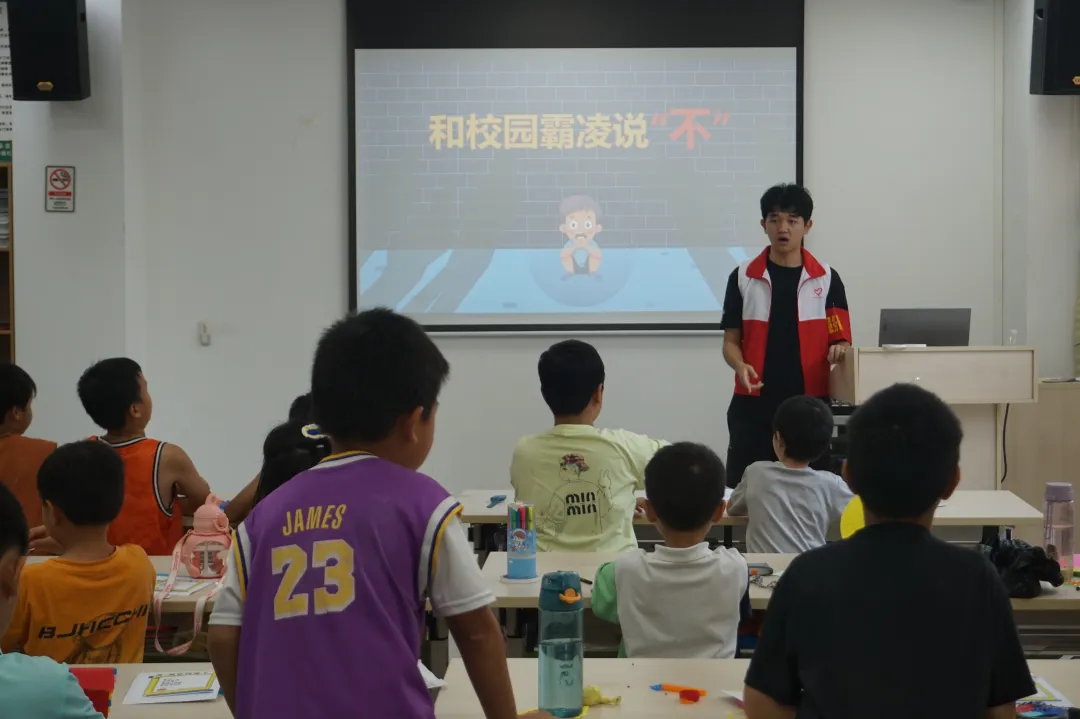 2025年7月16日,华南师范大学物理学院四进永和服务队成员黄子强在广州市黄埔区永和街社工服务站开展了主题为“和校园霸凌说‘不’”的心理健康课程。通过情景模拟、互动教学等形式,让小朋友们们深刻认识霸凌危害,掌握应对方法,共同筑牢反霸凌的防线。