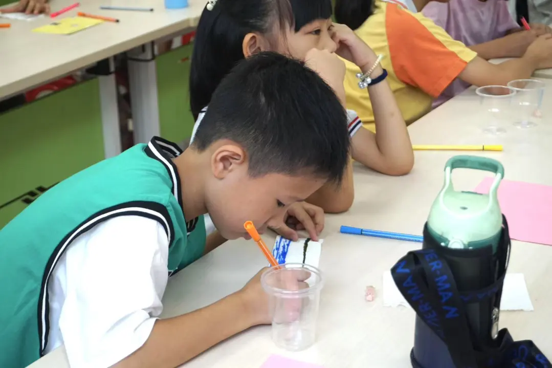 通过一系列学习后,小朋友们已经对光的色散有了初步认识。授课老师给他们播放了一个有趣的动画视频,并还向小朋友们介绍光的三原色——红、绿、蓝,用这三种颜色的光可以混合出其他颜色的光,如红光和绿光混合后形成黄光,当三种颜色的光混合后就形成了白光。小朋友们对于这一个现象觉得很不可思议。课程最后一个环节,授课老师让小朋友们在纸巾上画出彩虹的颜色,将纸巾的一部分放入水中后,纸巾上的色彩就扩散,形成彩虹搭桥,对于这一个小手工小朋友们都非常感兴趣,纷纷进入彩虹手工小世界。