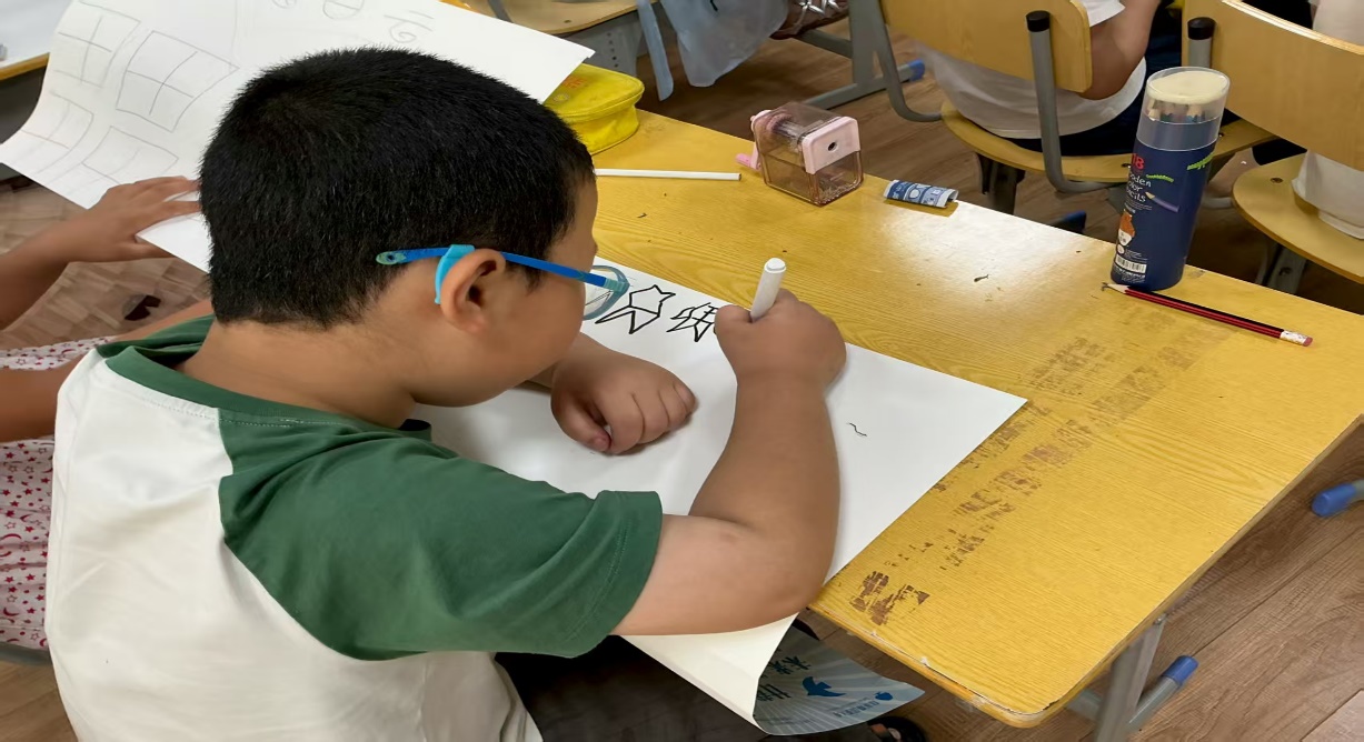 图为孩子正在完成甲骨文绘画作品何金琳供图