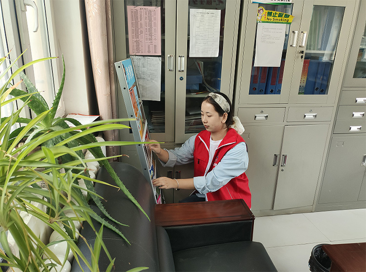 每天清晨,实践团成员会拿起扫帚对村委会院子及周边道路进行清扫。即使遇上闷热天气也未停下手中的活。午后,小广场的健身器材旁总有她忙碌的身影,她用湿抹布仔细擦拭器材上的灰尘。