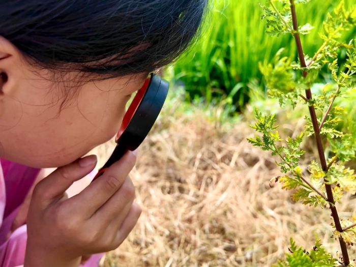 图为学生手持放大镜观察植物 张慧敏摄。
