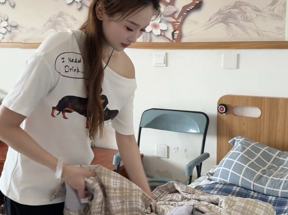 图为实践团成员为老人整理床铺