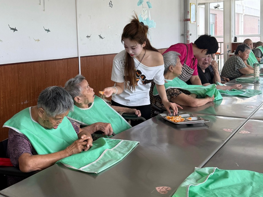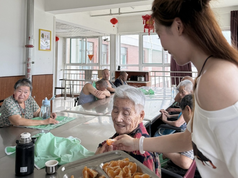 图为实践团成员喂老人吃水果
