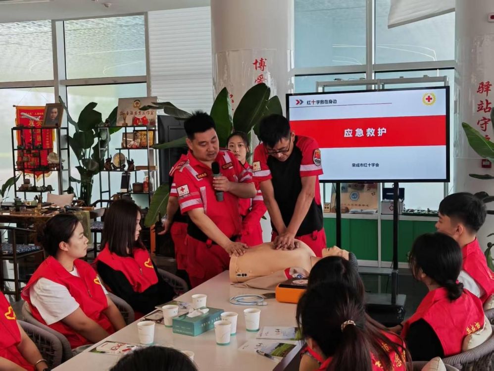 会议期间,荣成市红十字会代表刘建松等现场演示了心肺复苏急救方法,并详细讲解了除颤器的使用技巧。他们希望通过此次培训,帮助大学生代表筑牢安全意识,掌握应对支教过程中意外情况的有效处理措施。