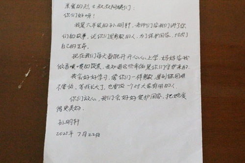 此次活动在孩子们心中激起层层涟漪。他们凝神倾听,听到动情处,清澈的眼眸里泛起晶莹的泪光。那份纯真的感动与懵懂的震撼,无声地诉说着历史的重量。在“写封信给先辈”环节,孩子们提笔凝思,一笔一画工整而庄重。稚嫩的笔尖流淌着对英雄的无限敬仰与感恩。