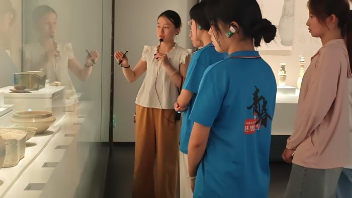 图为讲解宋代瓷器,包括河南登封窑珍珠地刻花瓷枕和江西吉州窑绿釉蕉叶纹瓷枕,除睡觉纳凉外,还能保持女性发型,因高度较高,寓意“高枕无忧”。