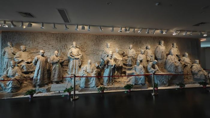 图为雕塑名人墙,陈列了20位徽州名人,代表性人物有:清代著名经济学家、财政专家王茂荫;新安画派开辟创始人、史上唯一僧人画师渐江先生;“中国铁路之父”詹天佑等