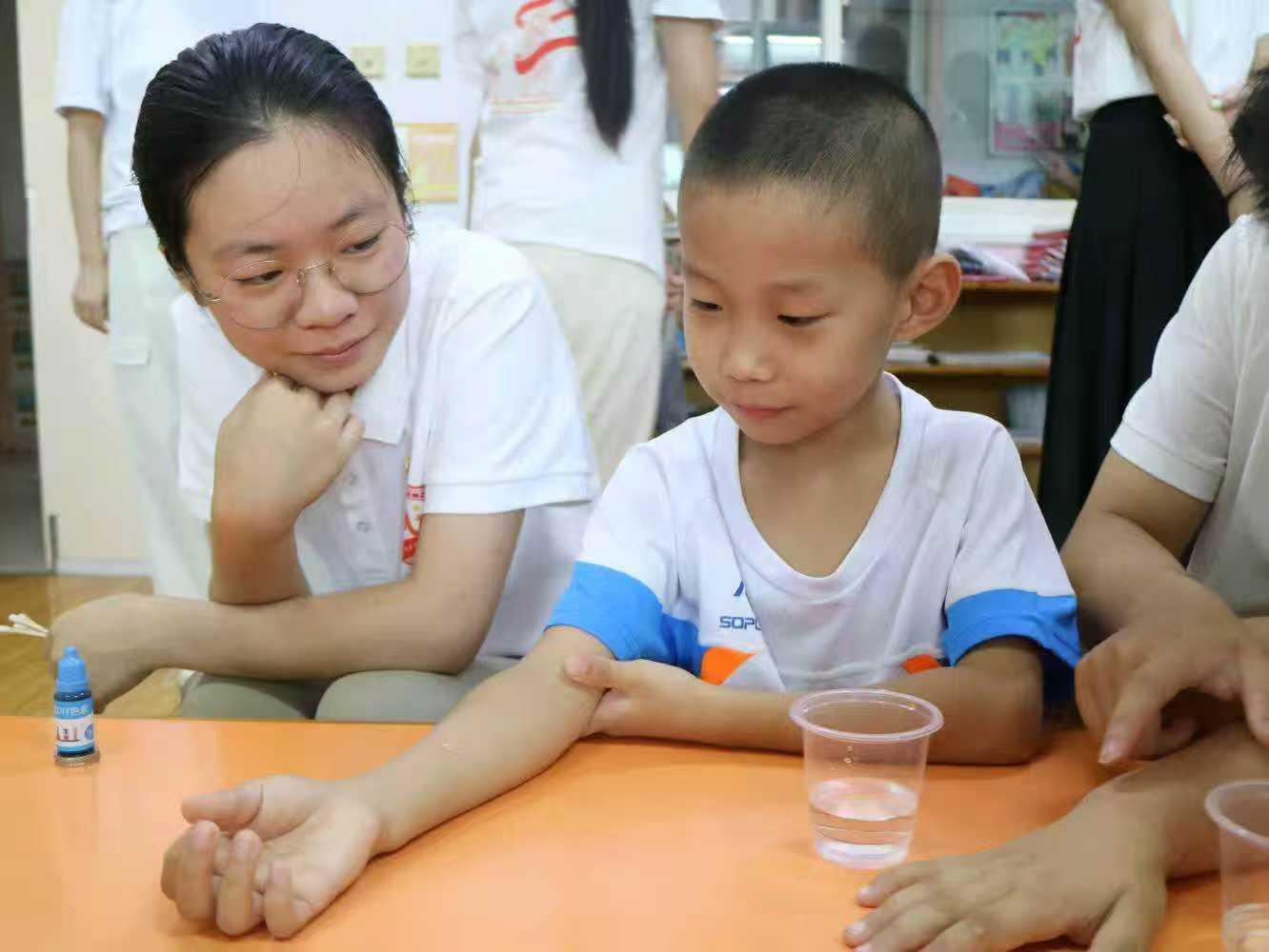 在趣味科学实验戳破水的“魔法膜”环节中,孙萌为孩子们演示水的“小魔力”现象。其他实践团成员引导儿童观察滴入彩色墨水的清水,当蘸有洗洁精的棉签触碰水面中心时,墨水因表面张力变化迅速扩散。该实验将复杂的科学原理转化为孩子们喜爱的“魔法”故事,帮助儿童理解科学原理。