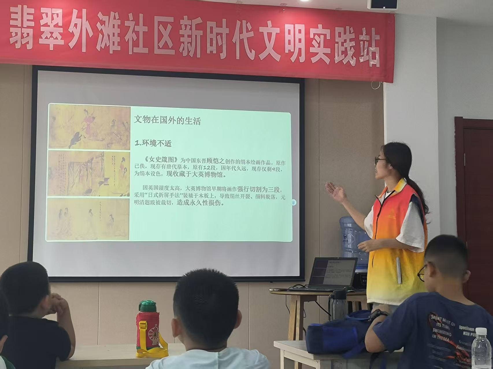 下午,志愿者开展了生动有趣的历史拓展活动,介绍了在大英博物馆的文物,让孩子们仿佛置身于历史的长河中,亲身感受那些古老文明的辉煌。志愿者们通过精彩的讲述和丰富的图片展示,带领孩子们领略中国流失海外的珍贵文物的传奇故事,点燃了孩子们对历史的无限热情。孩子们全神贯注地倾听,眼中闪烁着好奇与憧憬的光芒,仿佛自己也化身为小小探险家,在历史的长廊中自由穿梭。此次历史拓展活动不仅开阔了孩子们的视野,更在他们心中播下了热爱历史的种子,为他们的成长之路增添了一抹绚丽的色彩。