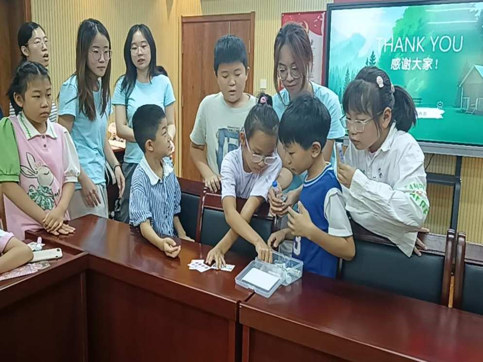 随后,在“小小水质检测员”环节,实践队员带领孩子们化身“科学侦探”。团队精心准备了矿泉水、自来水、肥皂水,柠檬水等不同水样,指导孩子们使用pH指示剂进行检测。“我的试管里的水变红了!”“这个怎么是蓝色的?”孩子们专注地比对色卡,在实践团员的引导下理解酸碱度对水生生物的影响。当发现日常饮用水pH值最接近中性时,孩子们恍然大悟:“原来保护湿地和水质健康息息相关!