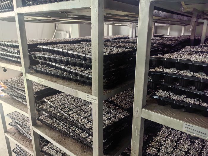 在基地的自动化播种车间,流水线的机械臂精准抓取育苗盘,依次完成装土、播种、覆盖、洒水等工序,节奏明快。“你看这个吸种装置,能把种子从料盒里精准吸到穴盘里,但偶尔会出现一穴两粒的情况,这时候就需要人工补位。”工作人员指着正在挑拣种子的工人解释,为避免后期幼苗争夺养分,每穴必须保证只留一粒种子,机器高效播种与人工精细补漏形成了完美配合。