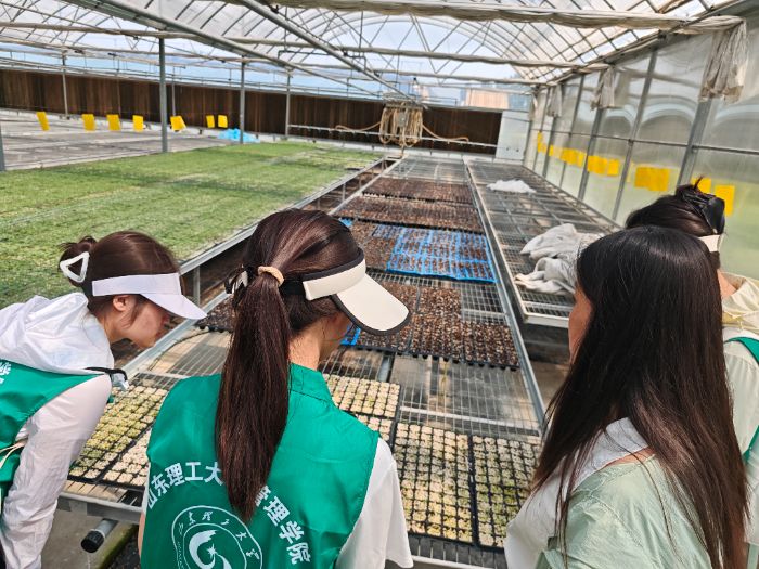 跟随转运车进入育苗大棚,实践团成员立刻被眼前的场景吸引:整齐排列的架子上,育苗盘有序摆放,部分刚播种的盘上覆盖着无纺布;黄色粘虫板悬挂在棚顶,棕色水帘在北侧不断循环流水,温度计清晰显示着棚内温度。“大棚是种苗的‘成长摇篮’,每一个细节都关乎出苗质量。”团队负责人指着棚顶的遮阳网解释道,“外层遮阳网防晒,内层遮阳网控温,配合水帘降温,能将棚内温度稳定在30℃左右,这是种苗生长的最佳区间。”实践团注意到,大棚内不仅有遥控水车每日洒水保湿,还有可摇动的分层架子——摇动装置能让架子从中间分开,方便工人在两侧摆盘,大幅提升操作便捷性。当被问及种苗管理时,团队负责人提到:“出苗后约1个月,我们会人工挑苗,按长势分级,拔除一穴双苗的多余植株,避免养分争夺。大苗优先发货,小苗继续培育,确保客户收到的都是优质种苗。”这种精细化管理模式,让种苗成活率提升至95%以上。