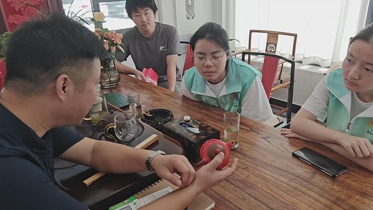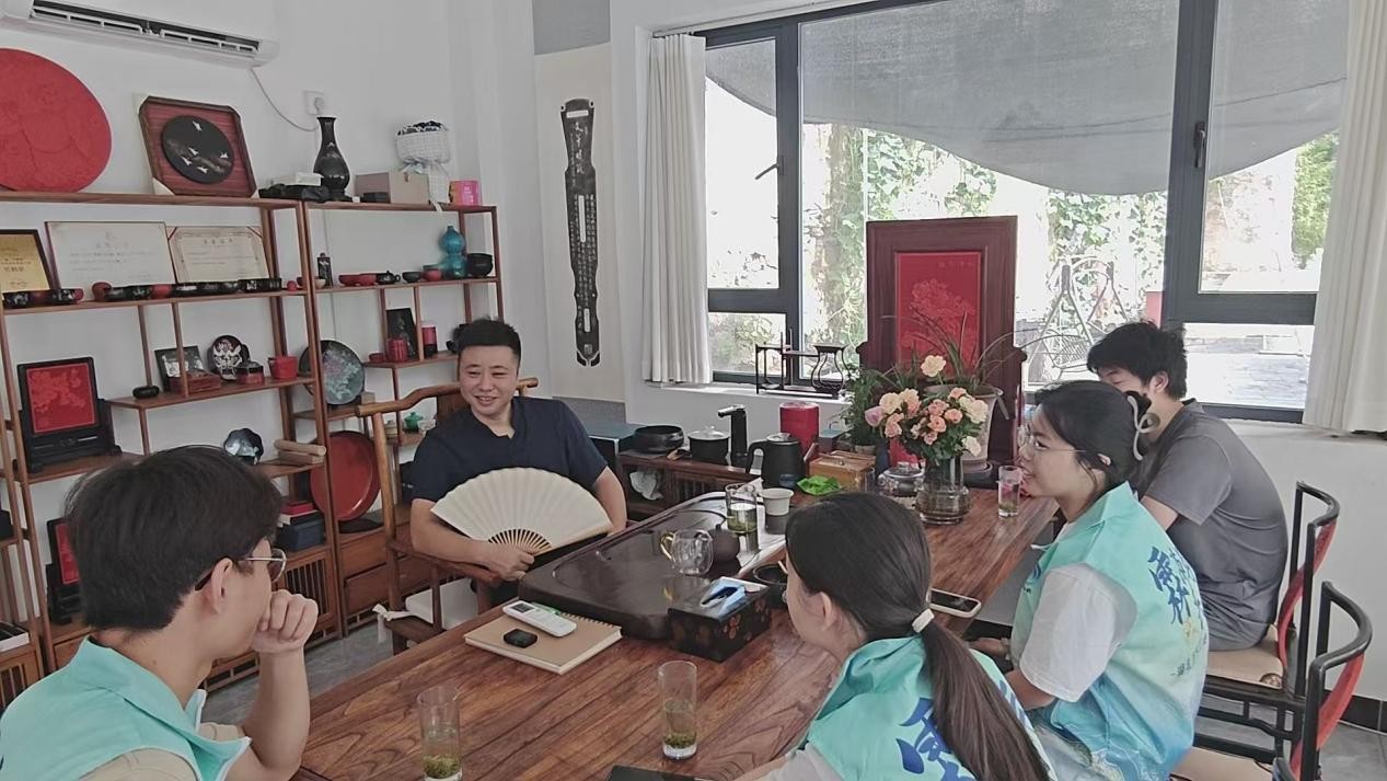 团队成员围绕生漆技艺细节、传承模式创新等问题踊跃提问,彭涛老师均耐心细致解答,现场交流氛围热烈。“从幼时对漆器的兴趣,到深耕生漆制作,再到如今把事业做得有模有样,彭涛老师的经历太让人触动了。”副队长陈玉洁感慨道,这场面对面的交流让团队对“非遗传承”不再是抽象的概念,而是真切感受到了背后的坚守与热爱。