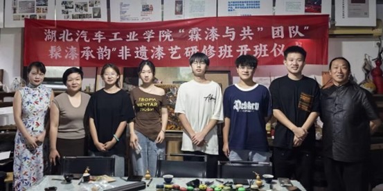 7月22日,湖北汽车工业学院“霖漆与共”团队的5名成员再次走进楚人漆屋,与非遗传承人刘善林教授携手开启“髹漆承韵”非遗漆艺研修班。一场融合专业传承与实践体验的非遗学习之旅正式拉开帷幕。