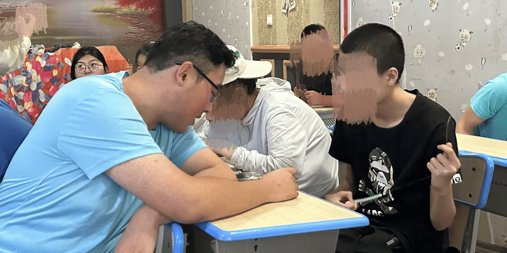 7月21日,细雨如丝,“助梦折翼天使”社会实践团队继续前往百灵儿童康复中心开展爱心帮扶活动。彩绳在指尖缠绕出星辰,小手跟着音乐划出彩虹。我们一起把珠子串成会讲故事的项链,让每一个手势都开出温柔的花。他们的眼神里,藏着被理解的光;我们的掌心间,传递着不说话的暖。此刻,没有“不一样”,只有一颗颗心在同个节奏里,轻轻跳动。--