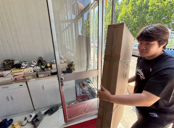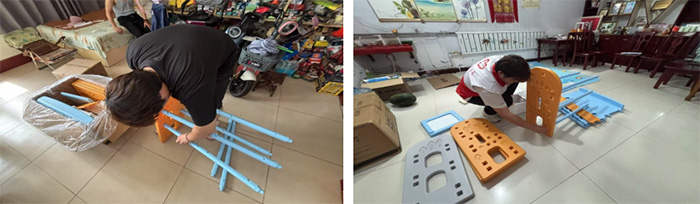 组装过程中,志愿者俯身拆包、比对说明书,指尖反复确认层板凹槽位置。电钻低鸣里,他们仔细校准每一处衔接,额角汗珠顺着下颌线滑落,随手用手背拭去。调整最后一块挡板时,水平仪气泡居中,志愿者才直起身轻舒一口气。