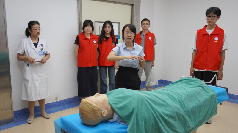 随后,实践团参与临床手术知识培训环节。在模拟手术室,医护人员以高仿真手术假人为教具,细致讲解一台外科手术的完整流程,从术前消毒、器械准备,到切口设计、组织分离,再到止血缝合、术后处理,每一个步骤都配合假人模型的解剖结构进行具象化演示。实践团成员围站在操作台周围,认真观察医护人员的操作流程。通过这种理论讲解与假人模拟操作相结合的方式,同学们不仅直观了解了手术的规范流程,更对医疗工作者严谨细致的职业素养有了深刻体会,为今后理解医疗服务流程积累了生动素材。