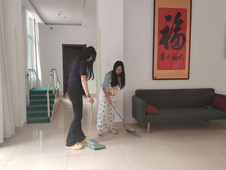 当日上午8时30分,实践团抵达中心后立即分组行动。第一组手持水桶与抹布,重点清洁公共活动区的玻璃窗。成员沾湿抹布细致擦拭窗框缝隙,并用干布清除水痕,阳光透过焕然一新的窗户洒入室内,大幅提升了采光效果。另一组同步进行地面清扫,使用长柄扫帚清除走廊角落积尘,再用拖把反复擦拭瓷砖地面。清洁结束后,成员进入老人居室协助内务整理。他们轻缓地帮卧床老人调整枕头高度,重新叠放凌乱被褥,并将杂物归置到床头柜中,使房间恢复整洁有序。