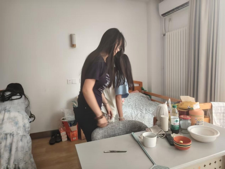 (图为赤心乡往实践团成员:彭祥娜,李雨彤,潘娅茹为老人整理床铺)