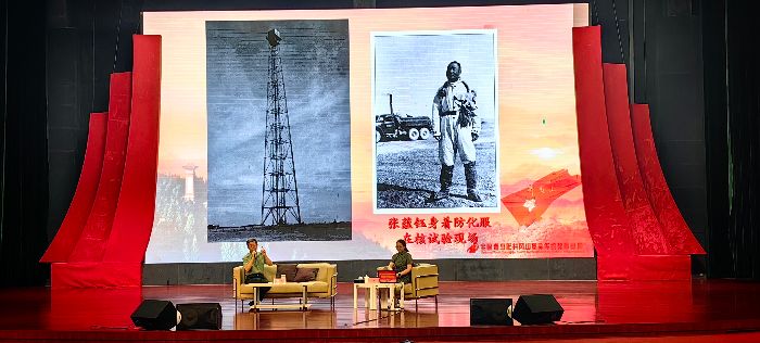 第二位嘉宾是中国核试验基地开拓者张蕴钰将军之子张旅天。他深情回溯父辈在我国核事业起步阶段的奋斗历程:从渤海之滨到西北大漠,张将军将一生奉献给中国核事业。同时,他通过讲述父亲与程开甲院士的故事,再现了那段历史中特有的革命情谊。随着主持人提问,张旅天同志将话题转向“核二代”的成长点滴,“地堡屋、马兰城、能把小孩卷跑的沙尘暴……”这些细节让实践团成员感同身受,实践团成员郭政辰感叹:“张蕴钰将军是一代核工作者的杰出代表。从渤海之滨到西北大漠,从戈壁铸就核盾牌,夯实国防根基。他们的奉献是马兰精神‘干惊天动地事’‘作隐姓埋名人’的缩影,激励着我们传承这份忠诚与担当,永志不忘。”