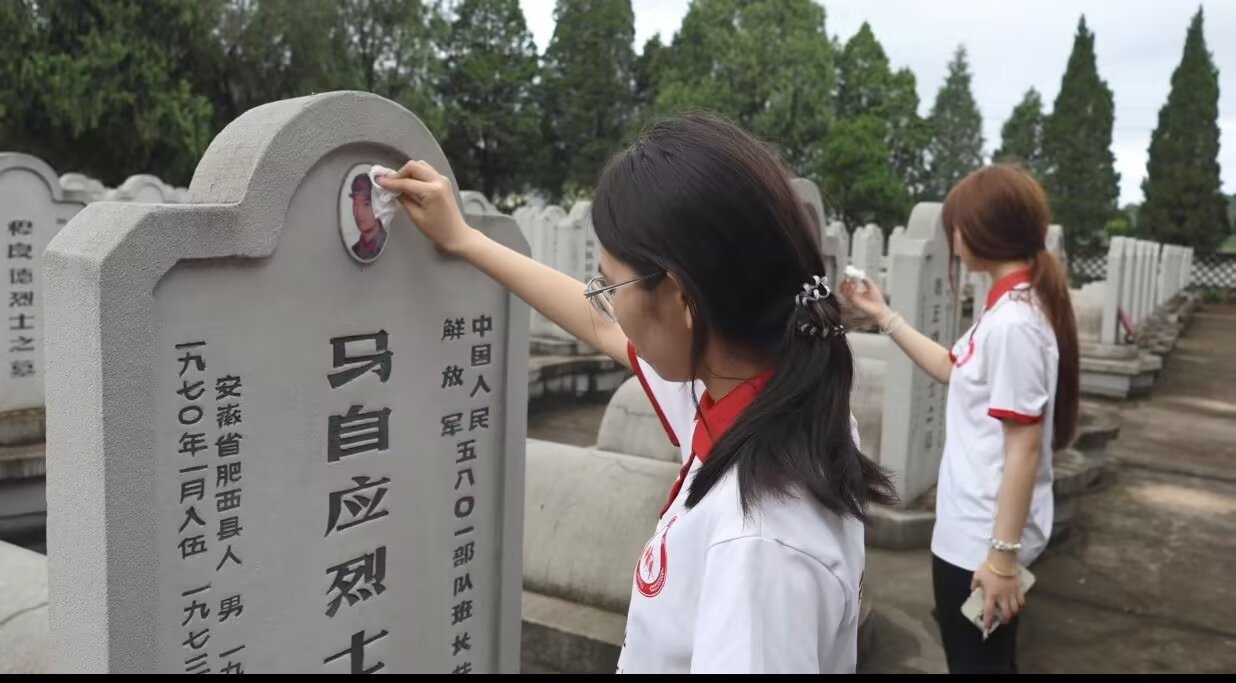 党史青年说实践队走进十堰市老营革命烈士陵园,巍峨的烈士纪念碑前,队员们列队整齐,向长眠于此的三线建设英烈深深鞠躬。肃穆的默哀仪式后,大家俯身清扫纪念碑广场的落叶,用抹布细细擦拭镌刻着英烈姓名的墓碑。指尖抚过那些斑驳的字迹,劳动的汗水混着崇敬之心,让队员们真切触摸到三线建设者“把一切献给祖国”的赤子情怀——正是这份无私奉献,让荒山野岭长出了工业脊梁,让青春热血融进了国家筋骨。让队员们从纷扰的世界抽出身,用心体会和平安定的世界背后是无数建设者的默默付出和坚守,队员们用行动宣告:三线建设者用热血写就的精神史诗,新时代青年必将以仁心仁术续写新的华章!