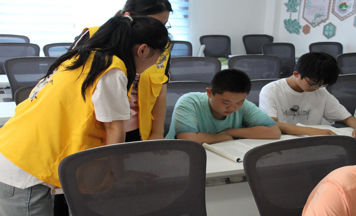 仪式结束后,实践团成员留下辅导孩子们的作业,通过这种方式加快熟悉对方,提升在未来课堂中的默契程度。