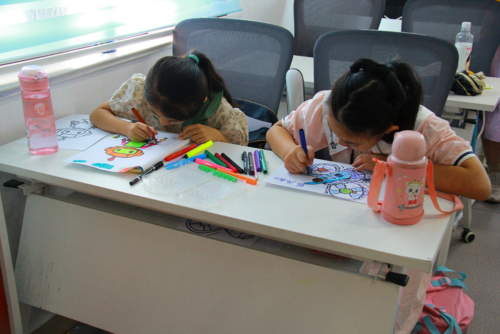 活动伊始,实践团成员给孩子们分发画具,对有畏难情绪的孩子递上参考线稿:“可以照着画,也能加上自己的想法哦!”孩子们眼中闪烁着兴奋的光芒。创作时,孩子们用稚嫩的笔触描绘出会飞的汽车、机器人老师等画面,实践团成员随时帮着削铅笔、换彩笔,时不时被奇思妙想逗笑。现场十分安静,只有画笔在纸上摩挲的沙沙声,孩子们全神贯注,每一个人都沉浸在创作的乐趣中。一小时后,作品陆续完成,孩子们在座位上等待评比。