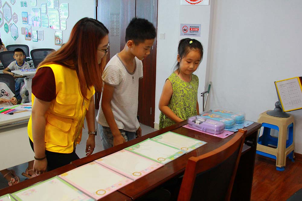 颁奖环节,实践团成员按小红旗数量排序,让得票最多的孩子先从奖品包中挑选,拿到钢笔的男孩举着奖品欢呼,选文具盒的女孩则开心地和同伴分享。