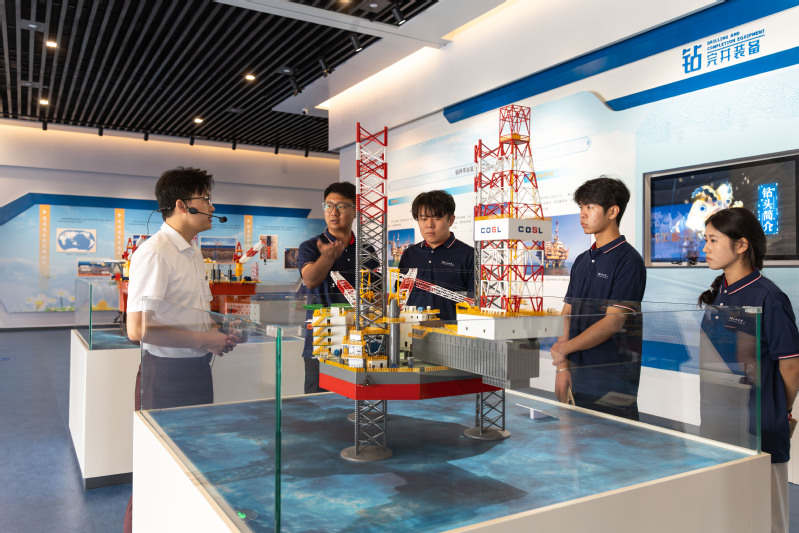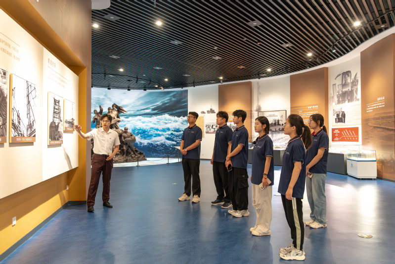 实践第三站,实践队员来到天津踏入能源企业,感受石油工人“我为祖国献石油”的赤诚之心。在中国海洋石油工业陈列馆,实践队员通过馆内丰富的展品、场景复原及多媒体技术,全景式回顾了中国海洋石油工业从艰苦创业到迈向新时代的辉煌历程。“海洋石油981”“深海一号”等现代化钻井平台实物模型巍然矗立,诠释了“科技驱动发展,创新引领未来”的内涵。高强度合金材料、复合材料等特种材料在海油开采中的应用,更点燃了实践队员“能源报国、材料报国”之心。