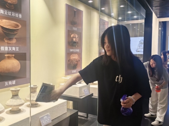 为了文物能够更好的被游客参观,成员们还进行了展品玻璃清洁工作。成员们拿着报纸和清洁玻璃水对展品的玻璃进行反复擦拭,每天闭馆前的集中清洁,他们会逐排仔细检查展柜,发现新的指纹或水渍就及时处理,以便营造良好的环境。