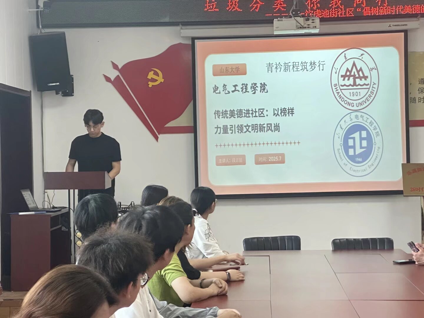 青春力量进社区,美德新风吹万家!为深入践行党的二十大精神,丰富中国式现代化新征程中的精神文明内涵,7月8日上午,山东大学“青衿新程筑梦行”社会实践队走进济南市市中区泺源街道饮虎池社区,开展“传统美德进社区:以榜样力量引领文明新风尚”主题宣讲活动。活动旨在响应时代对文化自信自强的呼唤,将社会主义核心价值观的深厚根基——中华优秀传统美德,如春风化雨般融入社区生活。