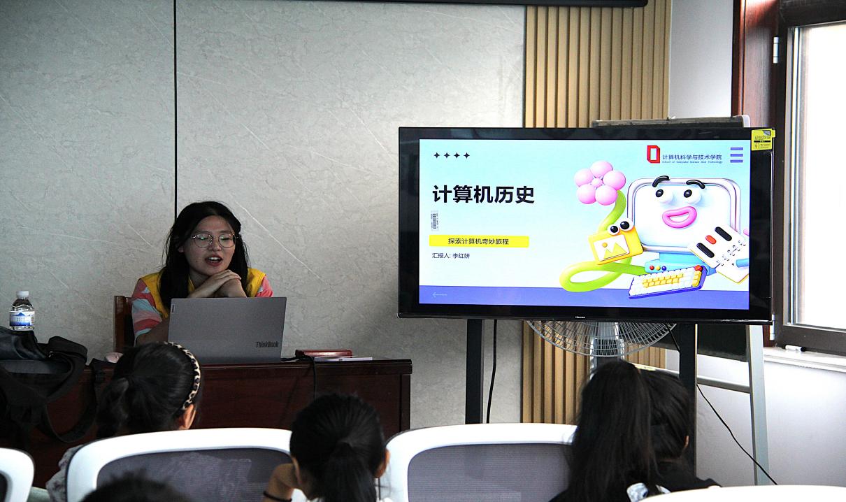 上午,实践团成员针对小学生群体,开展了趣味盎然的计算机发展历史科普课程。实践团成员制作的充满童趣的PPT课件瞬间抓住了孩子们的注意力。课程中,她通过一些简单的举例和互动的游戏,让孩子们初步领略了计算机的魅力。通过她生动地讲述计算机的发展历程,激发了孩子们对科技地强烈好奇心和探索欲。