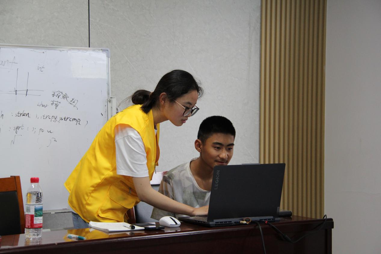 下午,面对知识储备相对丰富地初中生,实践团成员在简述计算机发展史后,引入了C语言基础知识教学,接着用通俗易懂的语言和生动有趣的实例,以及让孩子们亲自敲打代码,将原本抽象复杂的编程知识变得妙趣横生。从头文件的含义到简单代码的运行,同学们全神贯注地听讲,积极回答问题,与实践团成员展开互动。
