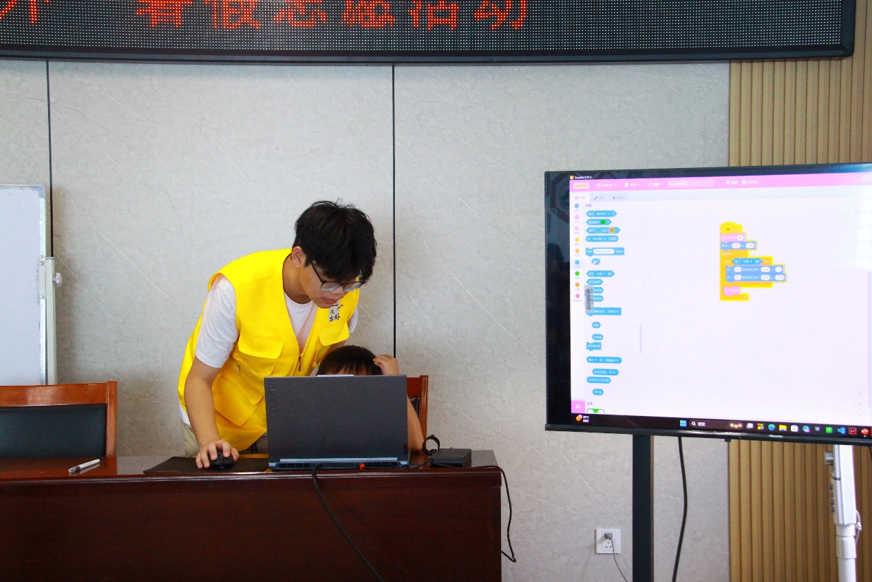 讲解结束后,实践团成员刘文强借助Scratch3带领孩子们制作简单小游戏。孩子们围在电脑前,眼神满是期待,跟着指导一步步操作,当自己制作的小游戏成功运行时,脸上露出开心的笑容。课后,成员们分组辅导作业,耐心解答各学科疑问,教室里学习氛围浓厚。