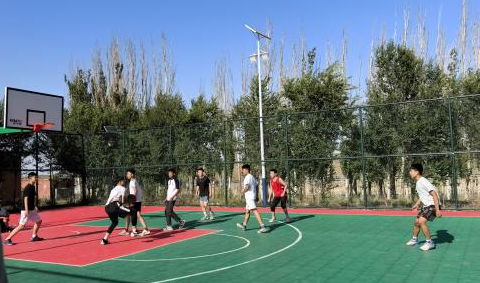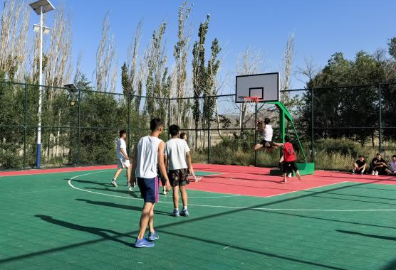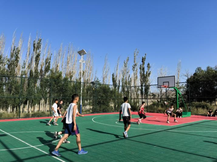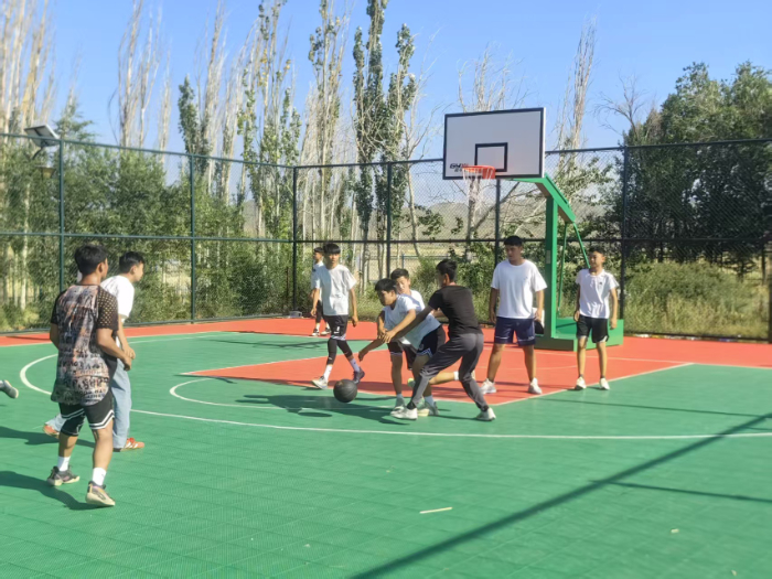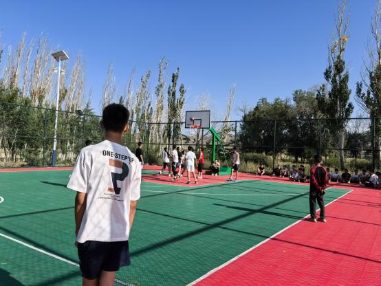 7月30日下午,“蔚梦疆来”实践团联合博斯坦乡政府,以铸牢中华民族共同体意识为主旨,加强基层体育文化建设,激发体育新活力为主要目标。博斯坦乡各村派出队伍,在博斯坦村委会前的篮球广场开展了初中组篮球赛的淘汰赛和半决赛。
