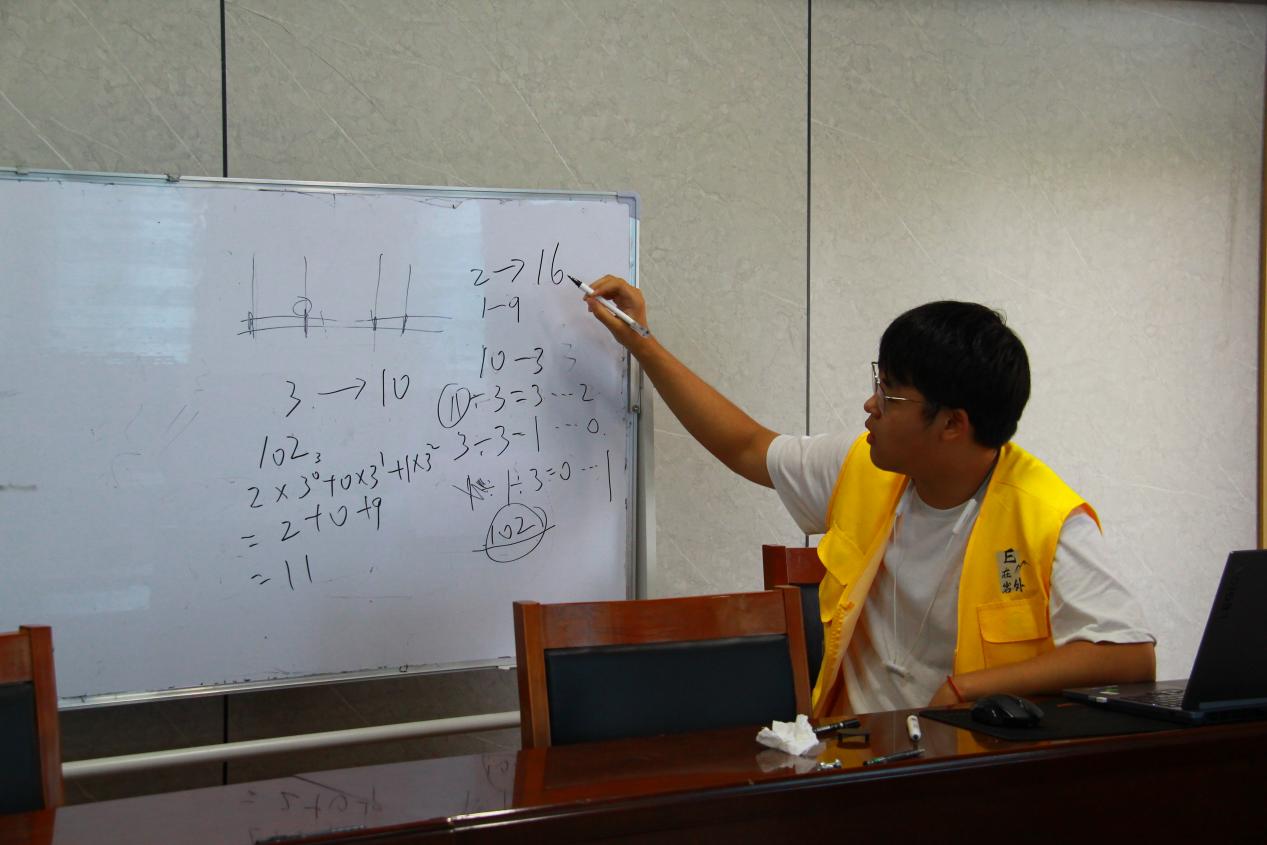 谈及应用前景,成员结合人工智能教育、智慧社区建设等实例,展现计算机技术在学习生活中的渗透,鼓励青少年“既要会用科技,更要懂其原理”。辅导环节聚焦进位制转换,设计“数字密码破译”任务,通过十进制与二进制对照练习帮助学生掌握转换规律,现场互动频繁,学习氛围浓厚。